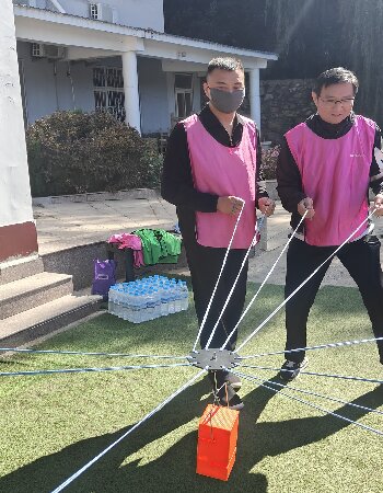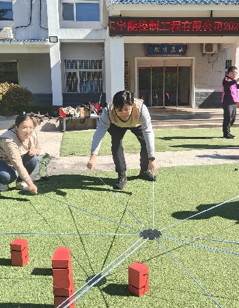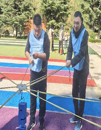 在“步步高升 ”游戏环节,大家分成两个小组,通过手拉绳子控制吊板,进行塑料盒累加操作,最后将塔叠加最高且没倒的队伍获胜。这个游戏不仅考验了身体协调性,也在欢声笑语中增进了团队成看员之间的默契和信任。